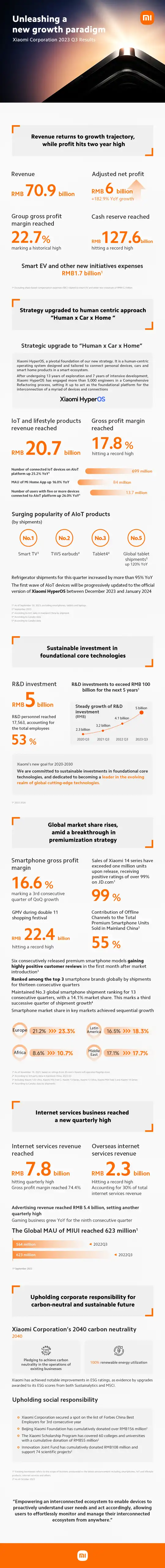 Nó nhấn mạnh cam kết mạnh mẽ của Xiaomi đối với việc đầu tư vào nghiên cứu và phát triển (“R&D”). Trong quý 3 năm 2023, chi phí R&D của Xiaomi đạt 5 tỷ RMB, tăng 22,0% so với cùng kỳ. Đội ngũ nhân lực R&D đã tăng lên chiếm hơn 53% tổng lực lượng lao động. Tập đoàn đã nâng cấp chiến lược từ “Smartphone x AIoT” lên “Human x Car x Home” và công bố hệ điều hành hoàn toàn mới Xiaomi HyperOS, tích hợp mọi nhu cầu của người tiêu dùng trong một hệ sinh thái thông minh từ thiết bị cá nhân, sản phẩm nhà thông minh, đến di động thông minh .
