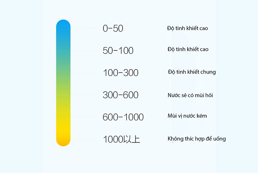 - 50-140 PPM: Nước lọc có thể uống được hoặc nước tinh khiết đã bổ sung khoáng.