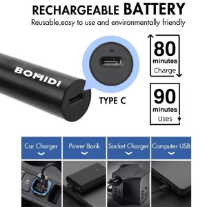 Việc trang bị động cơ mini thu nhỏ với khả năng hoạt động êm ái, Máy cắt lông mũi Bomidi NT1 được trang bị viên pin có dung lượng 600mAh và tích hợp cổng sạc Type C. Cụ thể khi được sạc đầy pin thì máy cắt lông mũi có thể hoạt động liên tục trong 1,5 giờ và có thể sử dụng trong 245 ngày nếu chỉ dùng 1 phút mỗi lần và tối đa 2 lần trong 1 tuần.