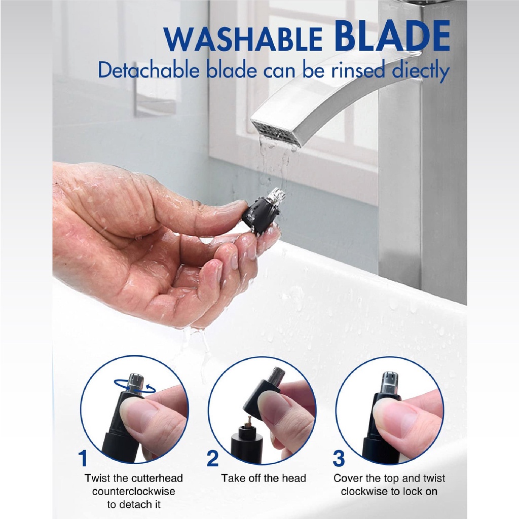 Ngoài ra, đầu lưỡi dao còn được thiết kế độc lập có thể tháo rời dễ dàng bằng thao tác xoay 1 nút. Chính vì vậy sau khi tỉa, cắt lông mũi người dùng có thể vệ sinh đầu dao sạch sẽ để ngăn ngừa vi khuẩn phát sinh bảo vệ khoang mũi tốt hơn.