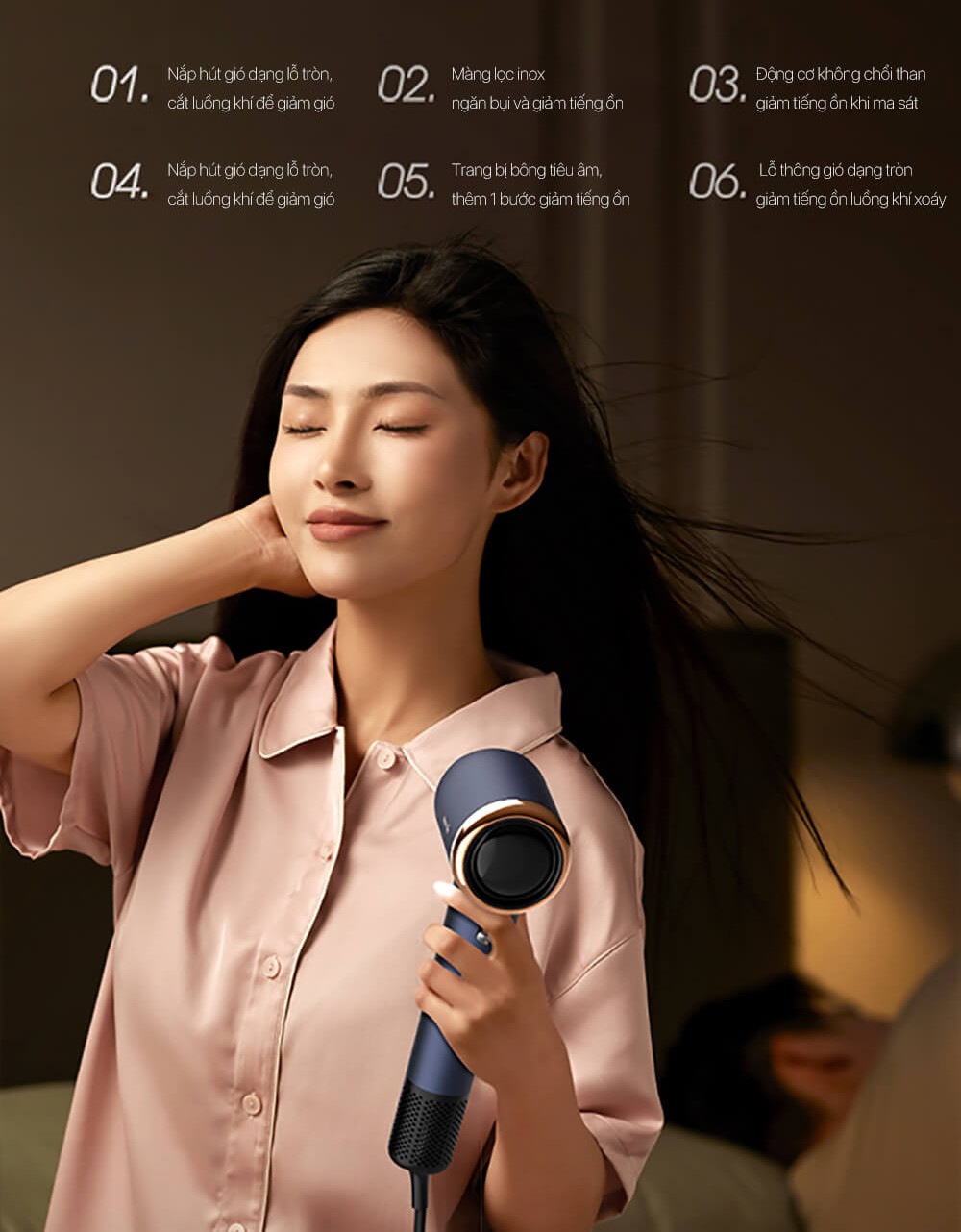 Deerma CF50W áp dụng công nghệ 6 bước giảm ồn, giảm ma sát động cơ. Đồng thời tối ưu hóa kết cấu luồng khí để giảm và cắt tiếng ồn của luồng khí, hiệu quả giảm tiếng ồn khi sấy, không làm phiền những người xung quanh