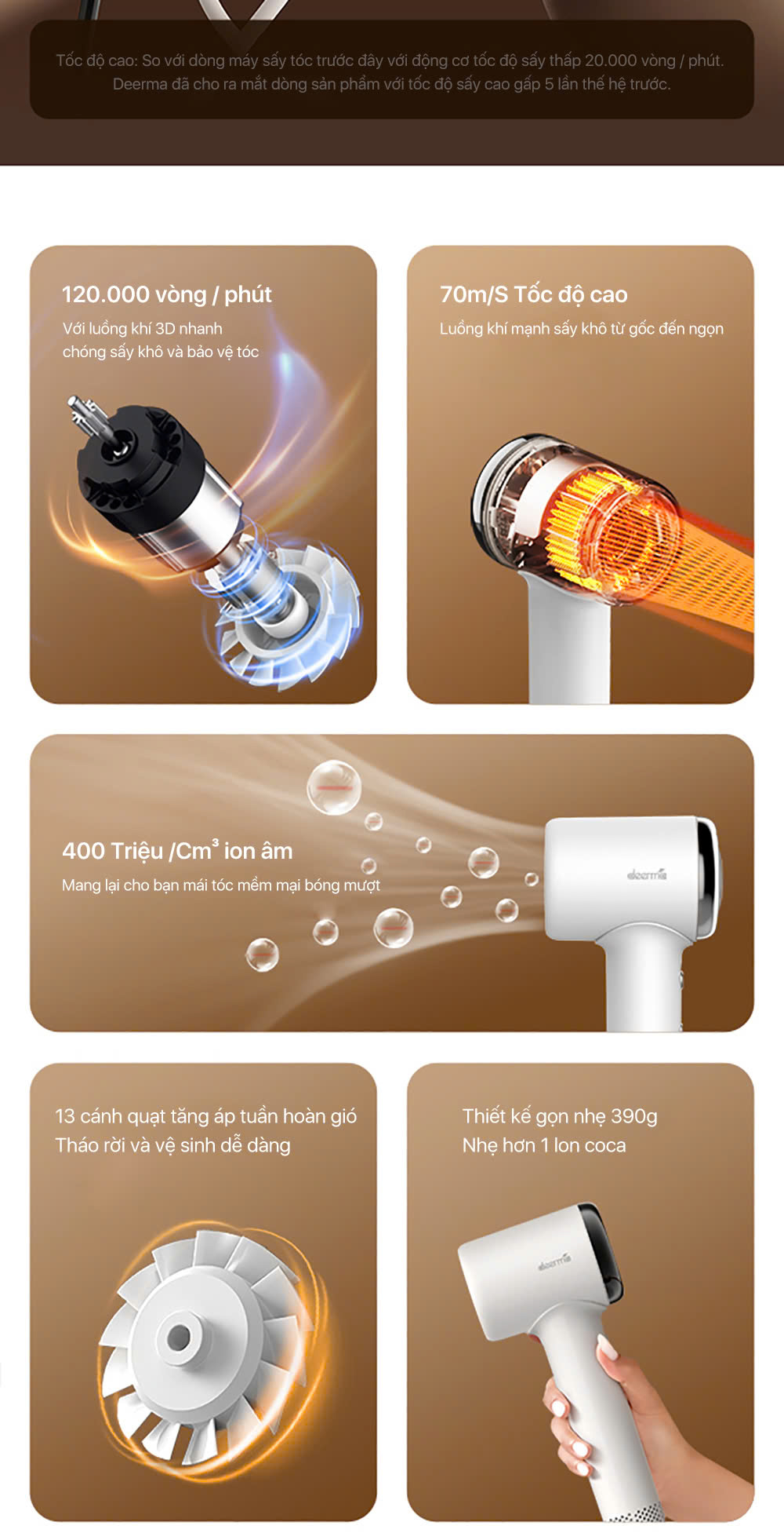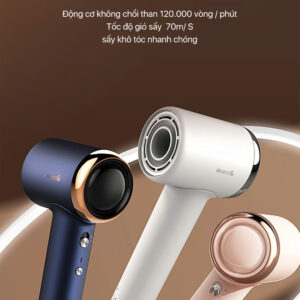 Máy sấy tóc tạo ion Deerma CF50W sở hữu động cơ DC không chổi than 120.000 vòng/phút để tạo ra tốc độ gió mạnh và kết hợp với luồng khí dịu nhẹ lưu thông tốc độ cao giúp nhanh chóng sấy khô và tránh nhiệt cao làm ảnh hưởng đến da đầu.