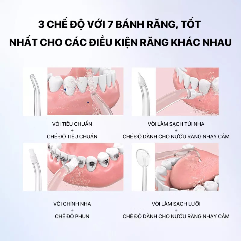 - Vòi phun: Tiêu chuẩn, chỉnh nha, túi nha chu, phủ lưỡi