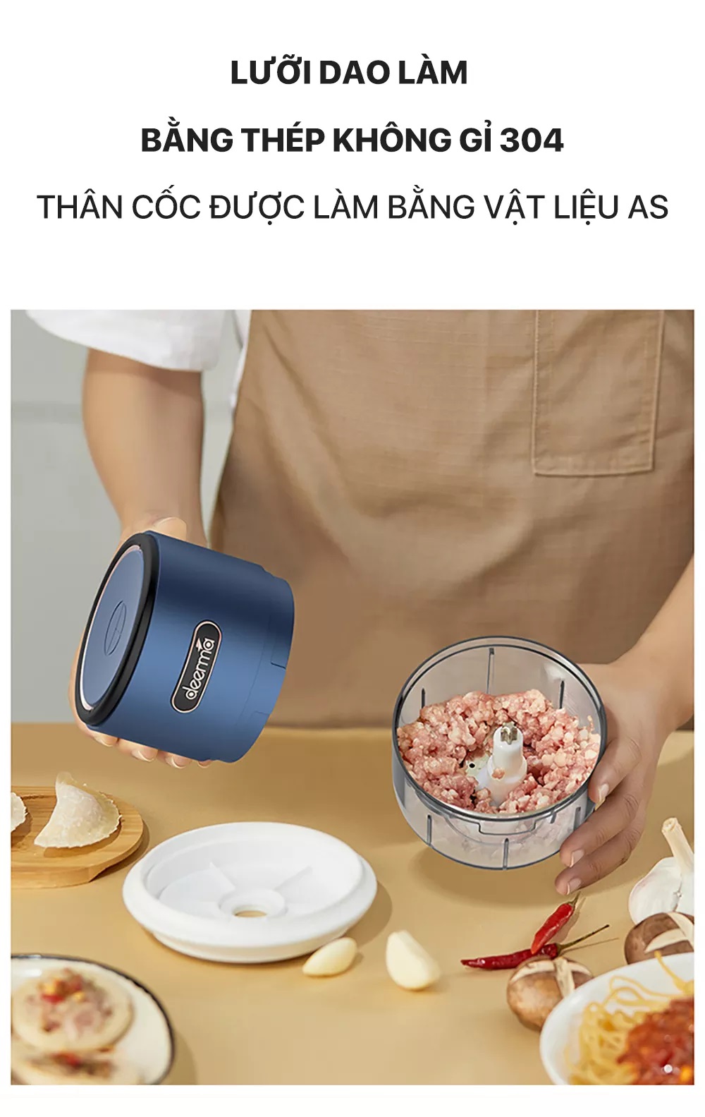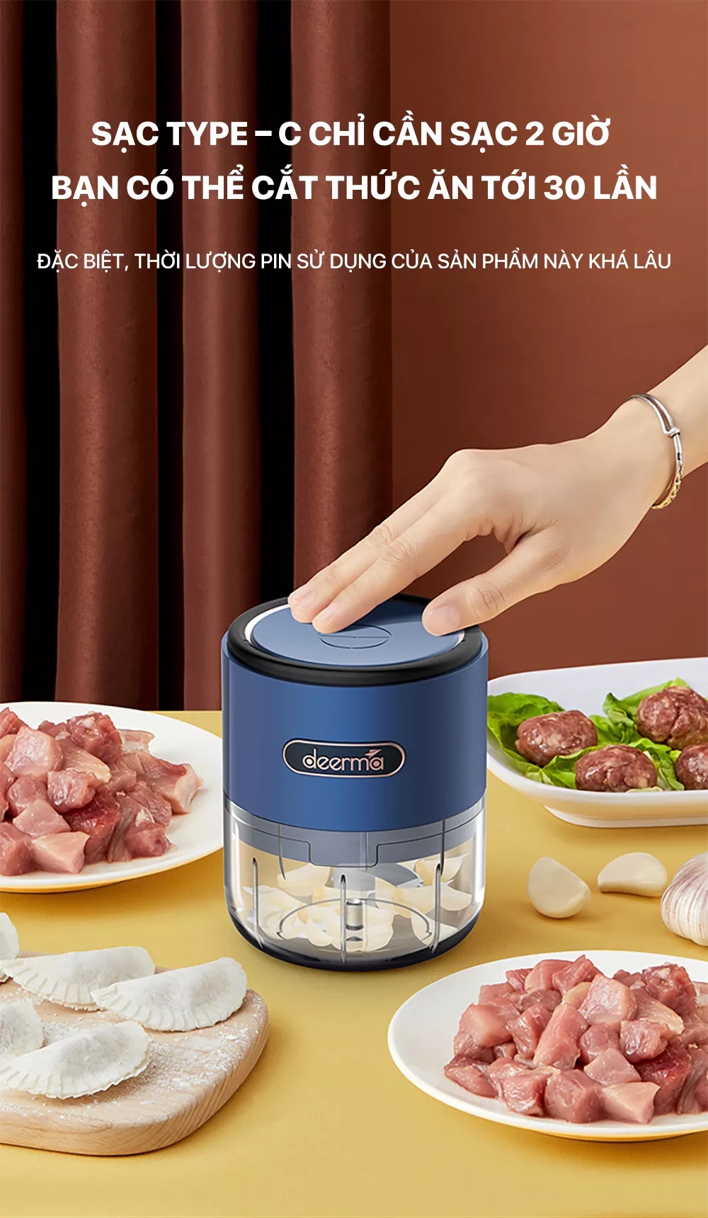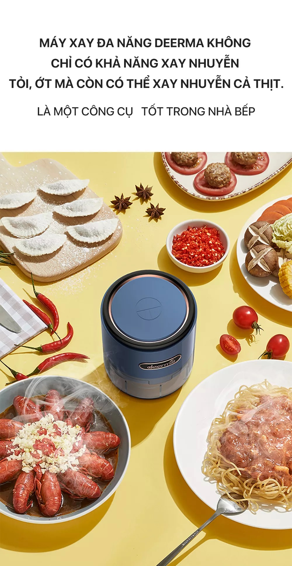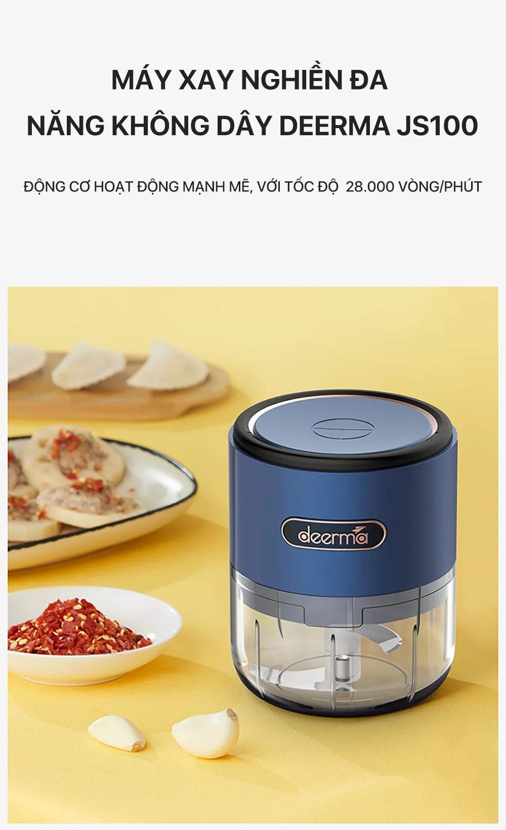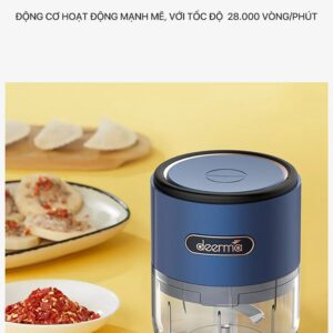 Máy xay nghiền đa năng không dây Deerma JS100 – cánh tay đắc lực giúp cho việc nấu ăn của bạn dễ dàng hơn, máy xay đa năng Deerma không chỉ có khả năng xay nhuyễn tỏi, ớt mà còn có thể xay nhuyễn cả thịt (thịt nạc cắt hạt lựu). Động cơ hoạt động mạnh mẽ, với tốc độ 28.000 vòng/phút, lưỡi dao 3 chiều quay và cắt với tốc độ cao khoảng 60 lần/giây, giúp cho việc nấu ăn của bạn nhanh chóng và gọn gàng hơn. Tuy nhiên, có một lưu ý nhỏ là không nên xay các loại hạt cứng như cà phê, đậu nành, gạo, đường phèn, đá viên, hoặc các thành phần tương tự khác.