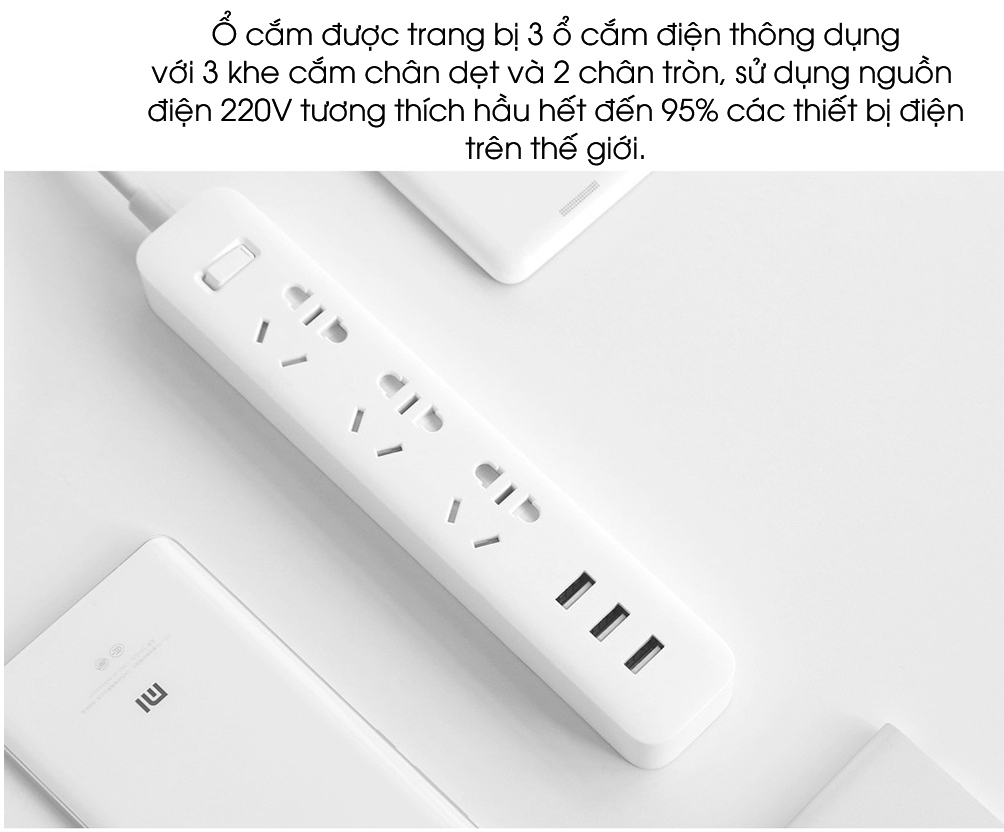 Sản phẩm trang bị 3 lỗ cắm điện phù hợp với nhiều đầu cắm khắc nhau cung cấp điện năng cho thiết bị điện dân dụng như: quạt, tivi, tủ lạnh, nồi cơm điện, đầu đĩa, bếp từ, bàn ủ Bên cạnh đó, sản phẩm được tích hợp 3 khe cắm USB, có thể sạc cho tất cả các thiết bị di động sử dụng cổng USB như iPhone, iPad, Samsung, HTC, LG…