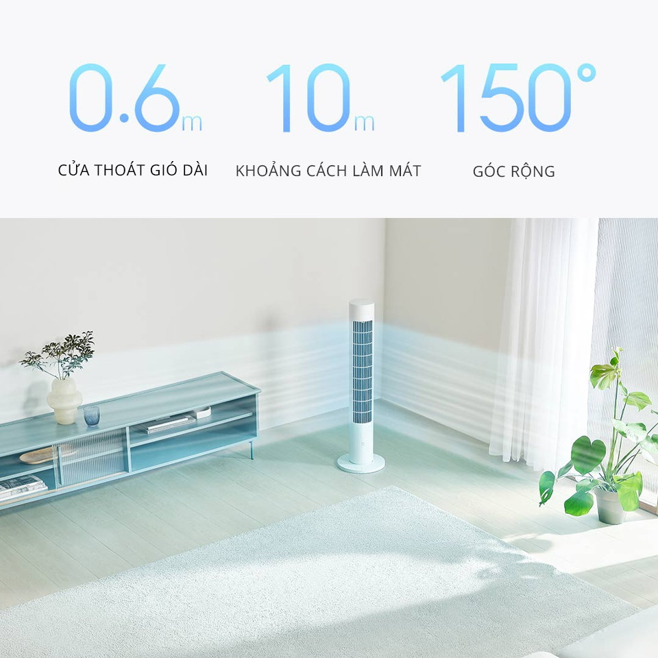 Quạt tháp inverter Xiaomi Mijia BPTS02DM cung cấp làn gió góc siêu rộng đến 150°, giúp tăng tốc luồng khí trong toàn bộ không gian và làm mát nhanh hơn. Đặc biệt, thiết kế dạng tháp cùng với cửa thoát gió dài 0.6m, nên quạt có thể cho khoảng cách làm mát đến 10m. Chính vì vậy, chỉ với 1 chiếc quạt tháp, dù bạn đang ngồi trên sofa hay sàn nhà đều có thể tận hưởng làn gió tự nhiên dễ chịu từ đầu đến chân. Các góc làm mát của quạt cũng có thể được tùy chỉnh dễ dàng thông qua App trên điện thoại.
