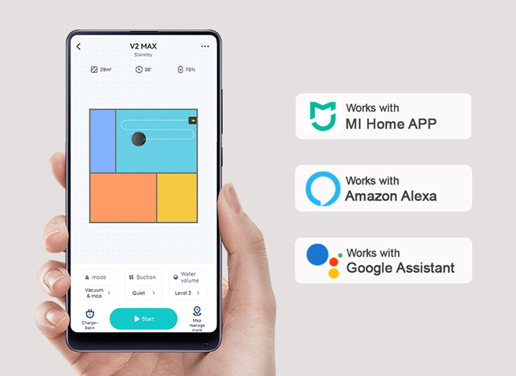 Người dùng có thể thoải mái kiểm soát việc dọn dẹp của robot và lên lịch dọn dẹp dễ dàng thông qua app Mi Home. Với sự hỗ trợ của Google Home hoặc Amazon Alexa cũng giúp người dùng sử dụng chế độ rảnh tay mà không cần phải thao tác trên điện thoại.