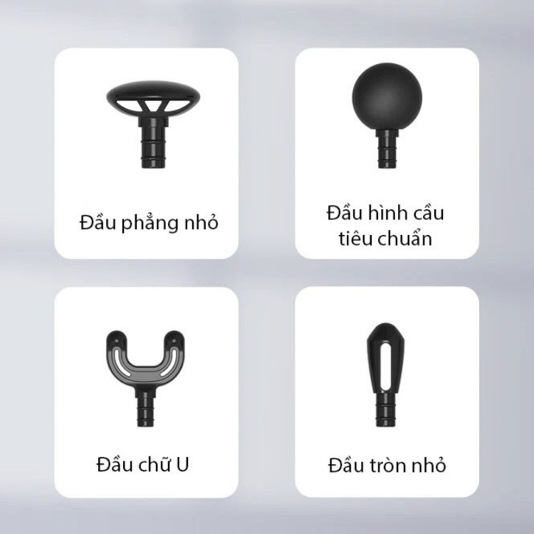 ĐẦU MASSAGE CÓ THỂ THÁO RỜI: sản phẩm có sẵn 4 loại đầu massage để đáp ứng nhu cầu của các cơ khác nhau. Đầu massage có thể được tháo ra để dễ dàng lắp đặt và vệ sinh.