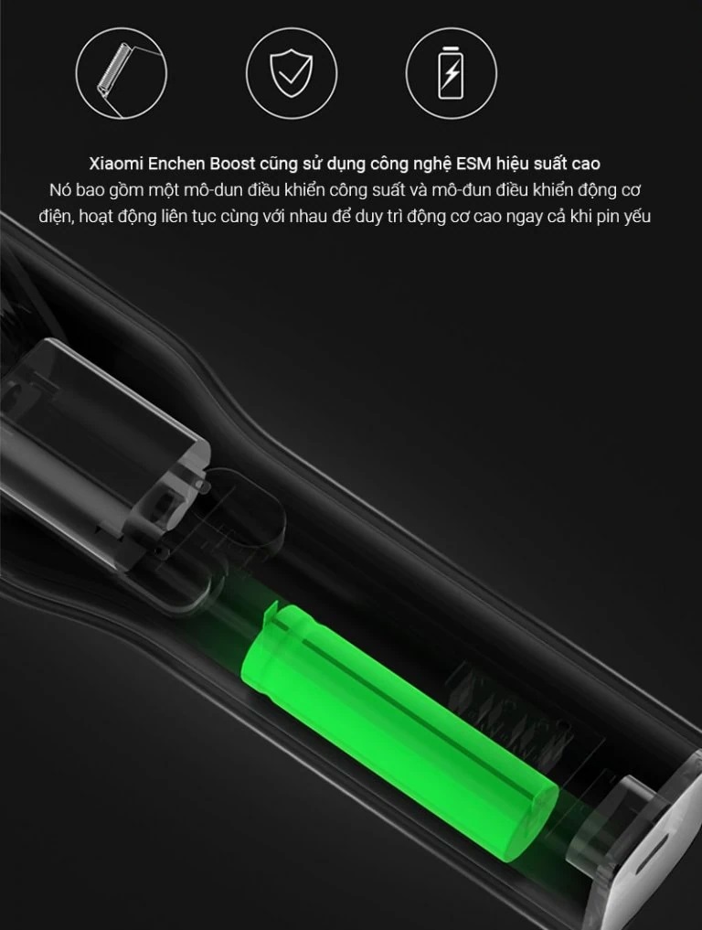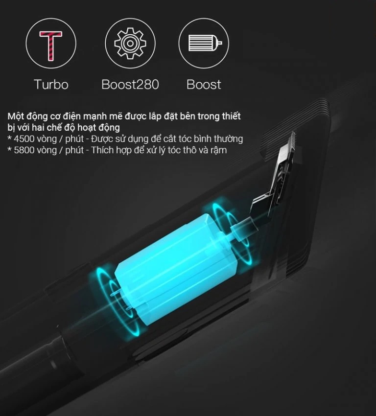 Tông đơ cắt tóc Xiaomi Enchen Boost còn được ứng dụng công nghệ chuyển đổi tần số kết hợp cùng động cơ 280 loại mạnh mẽ, hoạt động với công suất 5W. Từ đó cung cấp cho người dùng 2 chế độ chuyển đổi linh hoạt đáp ứng đầy đủ nhu cầu cho các loại tóc khác nhau. Tốc độ khởi động bình thường là 4500 vòng/phút phù hợp các loại tóc thông thường, mềm, sợi mảnh. Tốc độ “Turbo” với công suất mạnh mẽ 5800 vòng/phút giúp bạn có thể linh hoạt cắt mái tóc dày và cứng hơn.